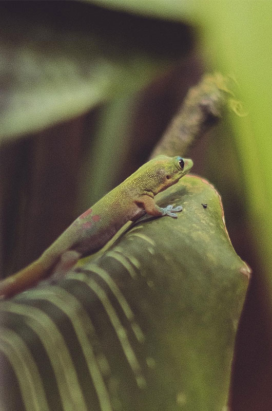 There are also over 100 gold dust day geckos among the tropical plants. Such a large population of these animals is considered zoological rarity. Anyone who goes through the tropical house with their eyes open on a warmer day can discover the colored geckos on the windows, on heating pipes or in the plants. They are used for pest control.