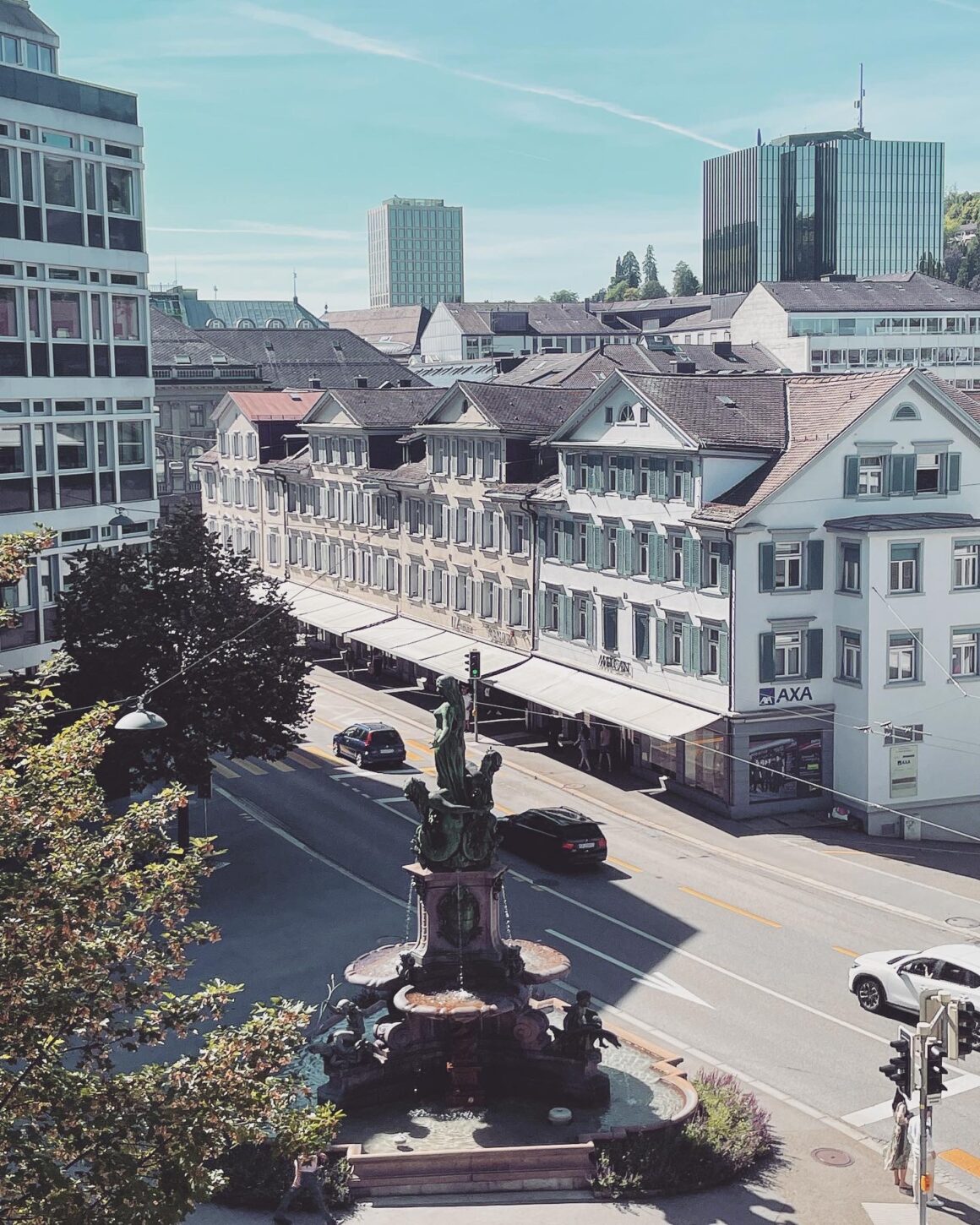This fountain was created by the sculptor August Bösch in 1895/96 in remembrance of the newly installed public water network, which supplied St. Gallen’s households with water from Lake Constance.