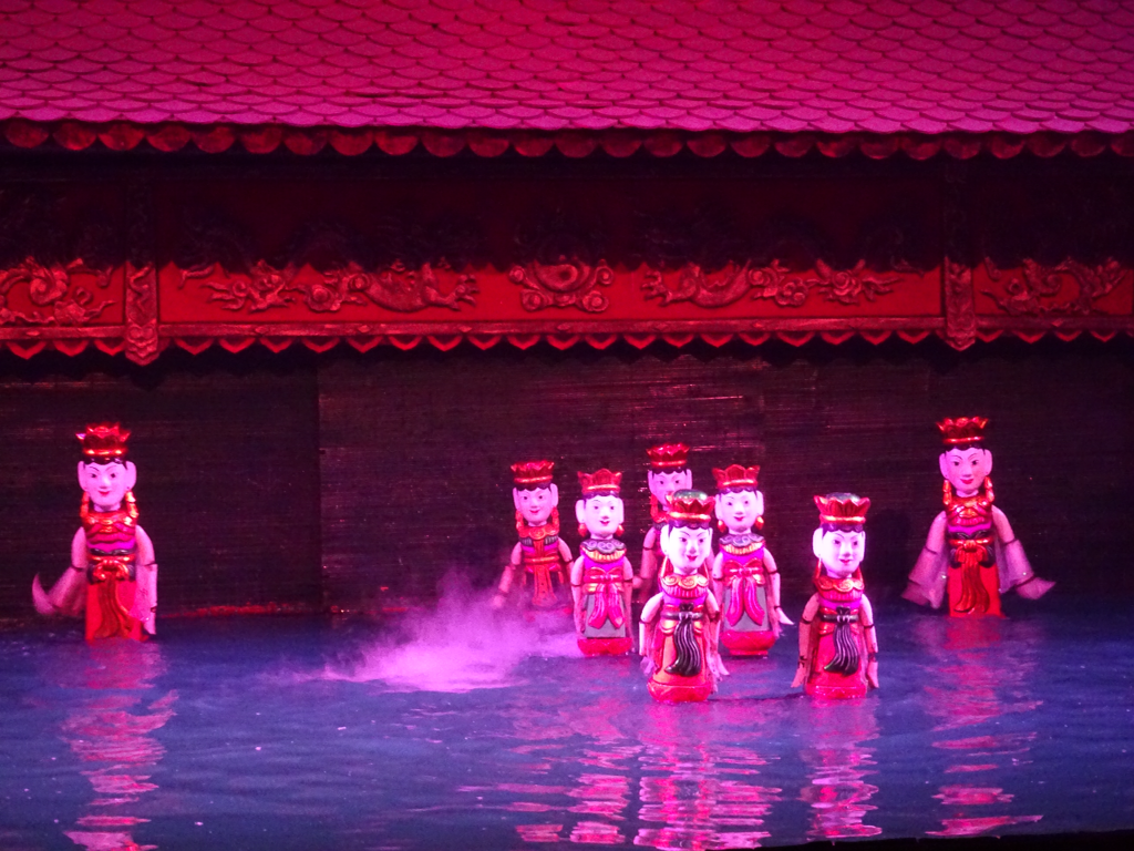 Ich habe schon lange nicht mehr so etwas lustiges gesehen! Das war so gut! Um 20 Uhr ging es für uns also ins Theater, unser Platz war in der zweiten vorderen Reihe, yes! Da wo man angeblich nass wird 😉 Dann beginn es, erst betraten die Musiker die Bühne und spielten ein Lied. Teils mit Instrumenten, die wir bis anhin noch nie live gesehen haben. Danach fing das Theater an. Natürlich haben wir einmal mehr nichts verstanden, das war aber gar nicht nötig, weil die Handlung offensichtlich war. Es wurden 14 verschiedene kleine Szenen gespielt und die 50 Minuten vergingen wie im Flug. Teils wurde Nebel eingesetzt oder brennende Kerzen oder gar Feuerwerk! Ich habe gelesen, dass es viele langweilig finden und eine Touristenfalle. Ich finde, dass die Vietnamesen viel mehr Spass verstehen, als die Indonesier mit ihrem Schattenspiel. Hihi.
